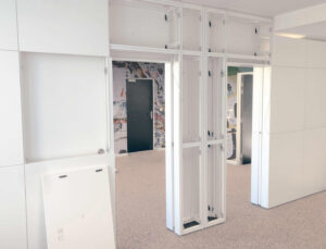 Les cloisons modulaires Ecotrad se montent rapidement, sans travaux lourds ni outillage spécifique. Le système de fixation par ferrures mâles et femelles assure un montage intuitif, un gain de temps sur site, une mise en œuvre propre et efficace.